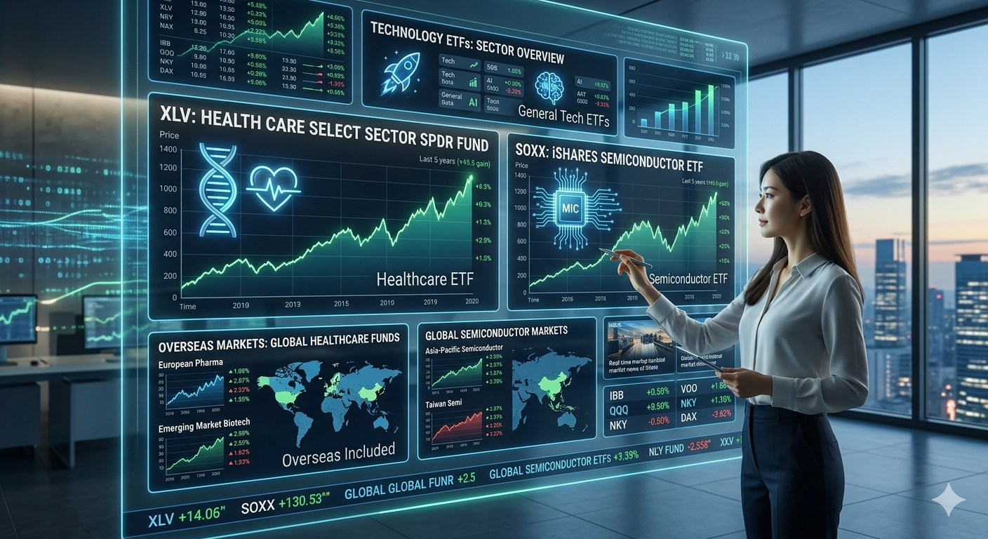 기술 섹터 내에서도 더 좁게 들어가면 SOXX나 SMH 같은 반도체 특화 ETF가 있습니다. 여기서 'SOXX'란 iShares 반도체 ETF의 티커명으로, 엔비디아·TSMC·ASML·AMD 등 AI 공급망 핵심 기업에 집중 투자하는 상품입니다. 저도 AI 붐이 한창일 때 SMH를 일부 담았는데, 변동성이 XLK보다 훨씬 컸습니다. 하루에 ±5%씩 움직이는 날도 많아서 심장이 약하신 분들은 조심하셔야 합니다.