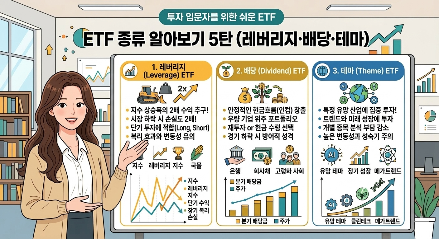 레버리지 ETF TQQQ는 나스닥100 지수 일간 수익률의 3배를 추종하는데, 2020년 이후 5년간 누적 수익률이 600%를 넘어섰습니다. 제가 처음 이 수치를 봤을 때 솔직히 믿기지 않았는데, 실제로 장기 백테스트 데이터를 확인하니 상승장에서는 정말 폭발적이었습니다. 하지만 제 경험상 2022년 조정장 때 이 상품을 들고 있던 지인들이 멘탈 관리에 얼마나 힘들어했는지 목격했기 때문에, 레버리지·배당·테마 ETF는 각자의 특성을 정확히 이해한 후 활용해야 한다고 확신합니다.